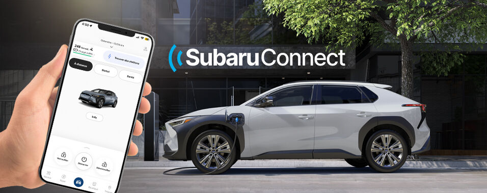SubaruConnectMC1** est une technologie embarquée qui relie votre Subaru Solterra au monde qui l’entoure, ajoutant à la sécurité, à la sûreté et à la commodité de tous vos trajets. Utilisant un réseau sans fil embarqué et relié à l’application SubaruConnectMC par le truchement de votre téléphone intelligent, le système vous tient au fait de l’état de votre véhicule, vous permet de transmettre cette information aux agents de SubaruConnectMC et vous procure la tranquillité d’esprit que vous méritez.